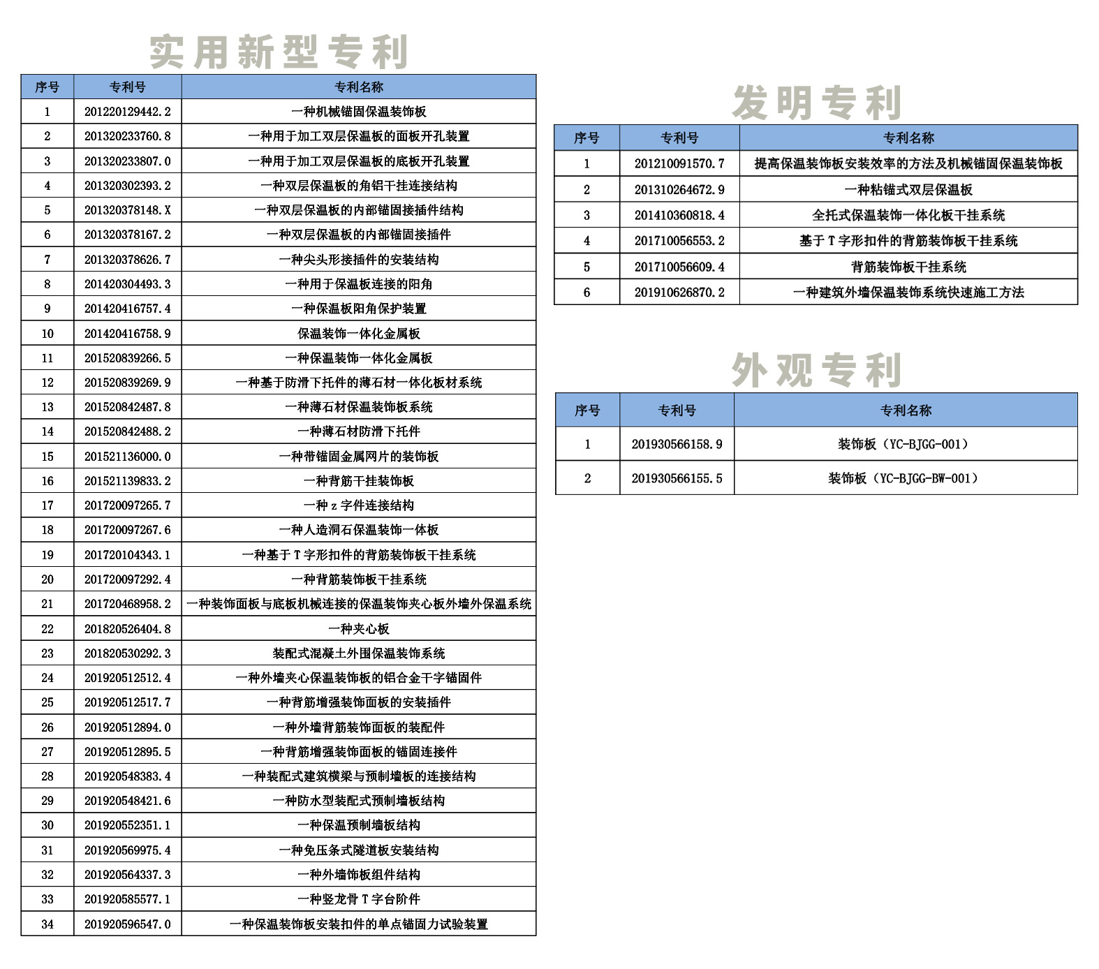近年來,我司研發(fā)中心圍繞既定的研發(fā)方向,累計組織實施了對影響保溫裝飾夾心板現(xiàn)場拉拔強度各因素的研究等18項科研項目。公司積極將研發(fā)成果轉化成知識產權,已獲發(fā)明專利6項、實用新型專利34項,發(fā)明審中專利10項,外觀專利2項,大部分科研成果已投入實際生產(或應用于實際生產)。